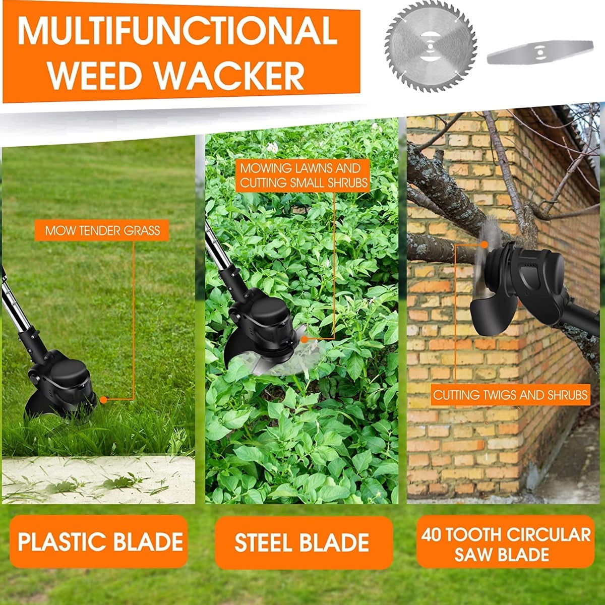 2 Blade Types Cutter:The metal blade is used for cutting thick grass and small shrubs, and the saw blade is used for cutting shrubs and thick branches. Sufficient quantity will allow you to meet your replacement needs without frequent purchases.