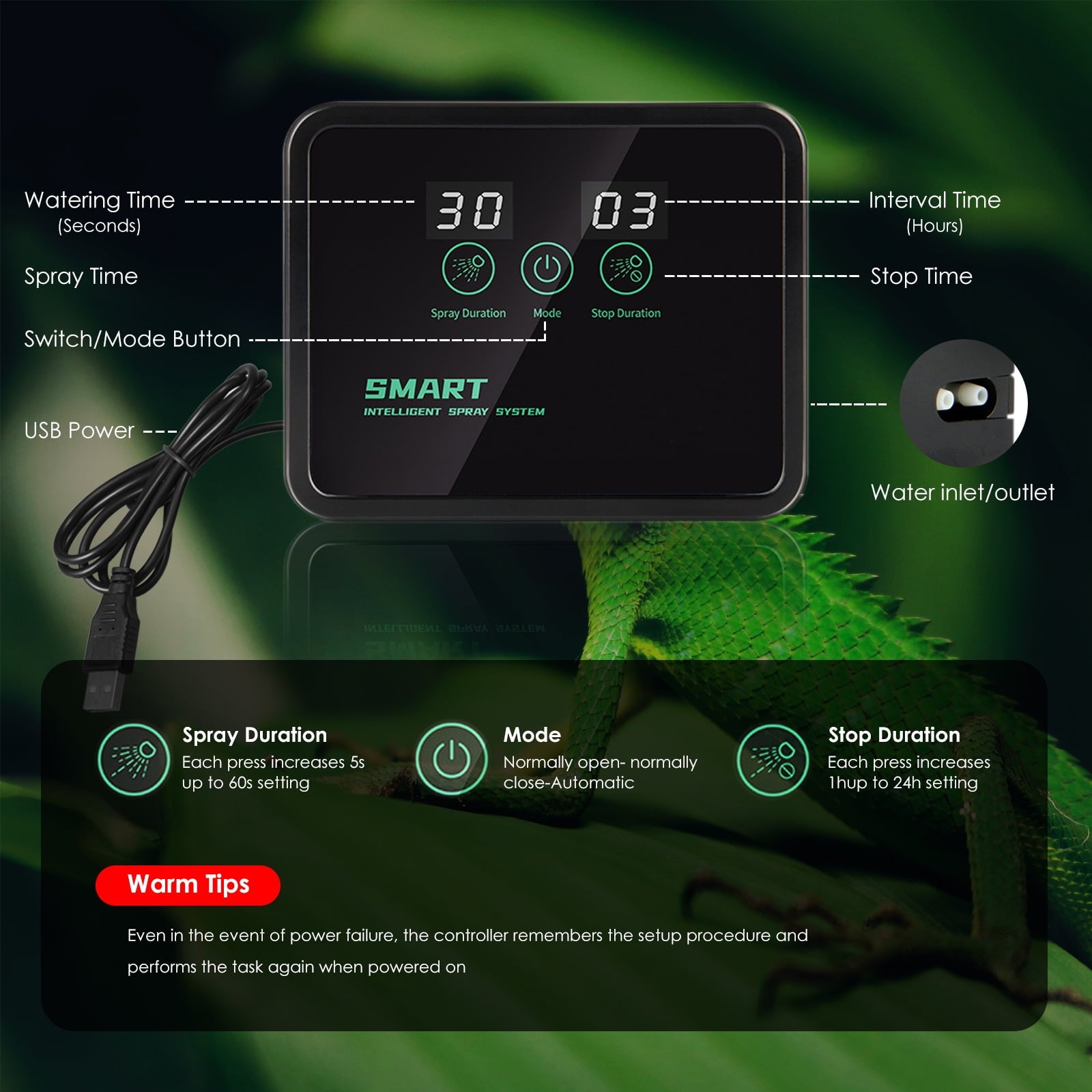 - 3.Automatic Memory System----You only need to set the time of each spray(5S, 10s, 15s... 60s) and the interval between two injections (1H, 2h... 24h), and it will execute circularly. Even in the event of power failure, the controller remembers the setup procedure and performs the task again when powered on