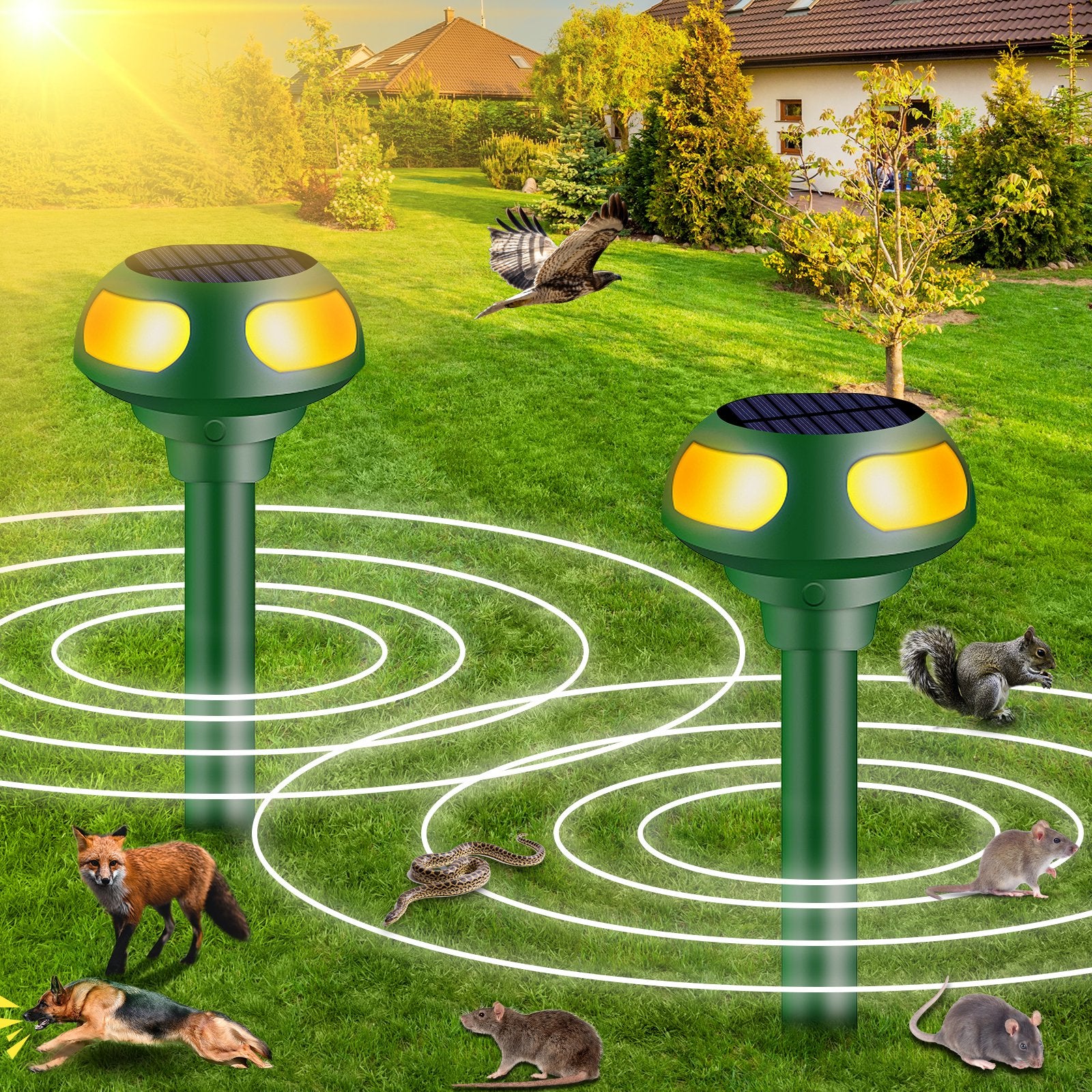 JahyShow Solar Animal Repellent, 2Pack with Sound & Light Outdoor Pest Control Device Farm Yard Protection